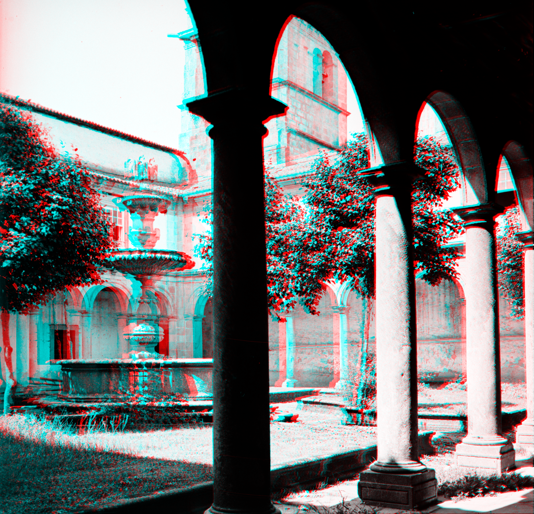 [Number 324; Date 2 September 1909; Hour 12 1/4; Light Sun; Lens Vérascope off-center; Diaphragm 8; Medium Agfa Chromo Isolar; Subject matter Paço de Sousa. Monastery. Cloister; Exposure 1/9’’; Development Ducancel Pyro Acetone].